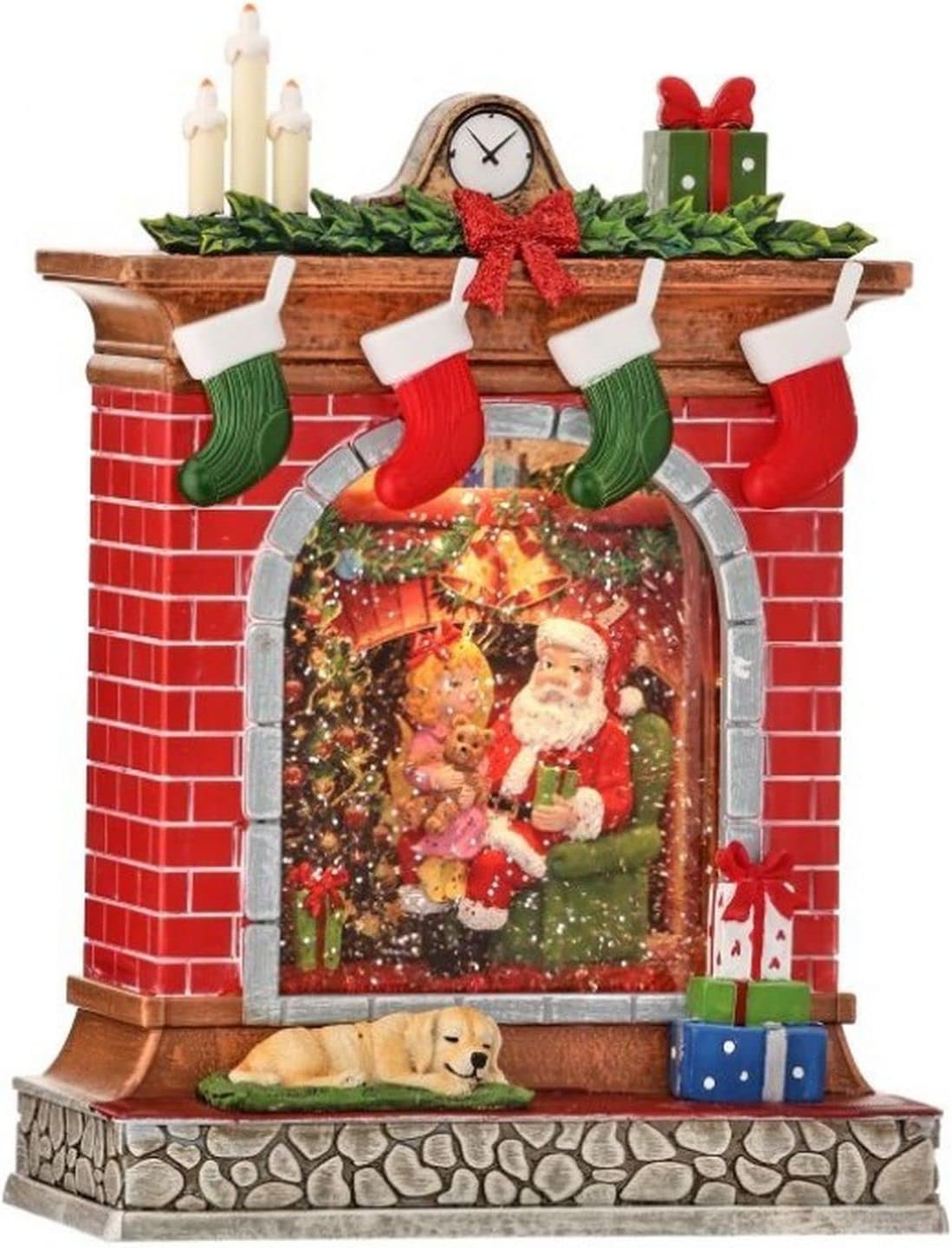 Chimenea navideña decorativa con luz LED y escena de Santa junto al árbol. Detalles de calcetines, regalos y perrito que aportan calidez a tu Navidad.