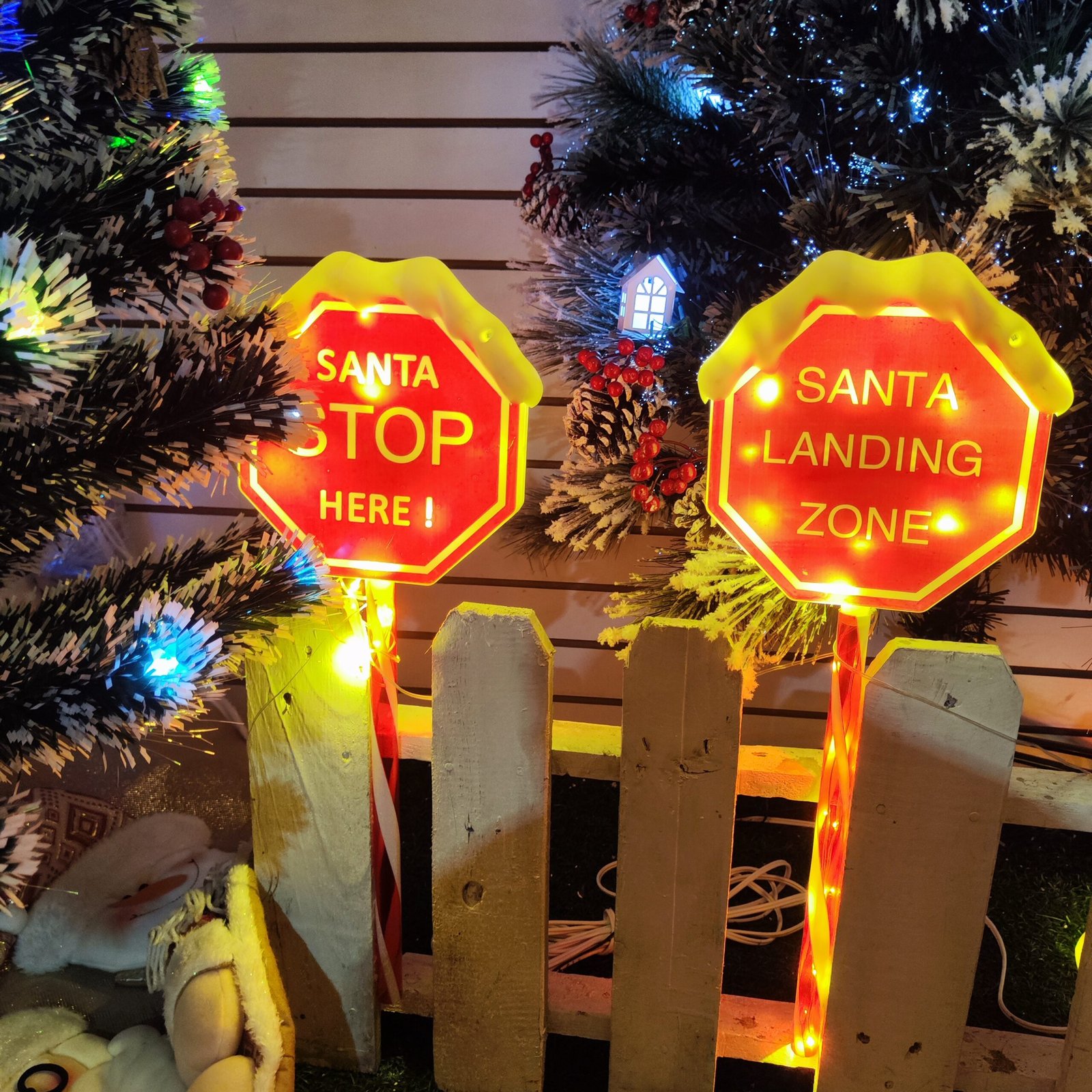 Letrero navideño tipo “stop” con luces LED y mensaje para Santa, ideal para jardín, entrada o decoración junto al árbol.
