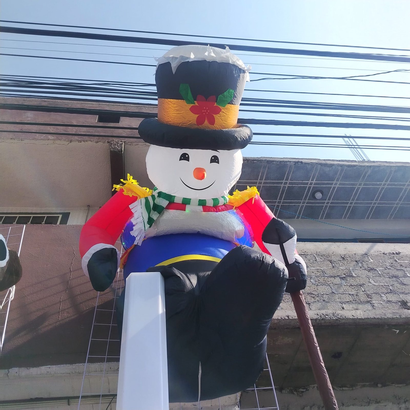Haz que tu fachada se vea espectacular esta temporada con este muñeco de nieve inflable gigante. Su diseño incluye sombrero de copa negro con detalles navideños, saco rojo, bufanda a rayas y un bastón café que le da un toque elegante y divertido a la vez.