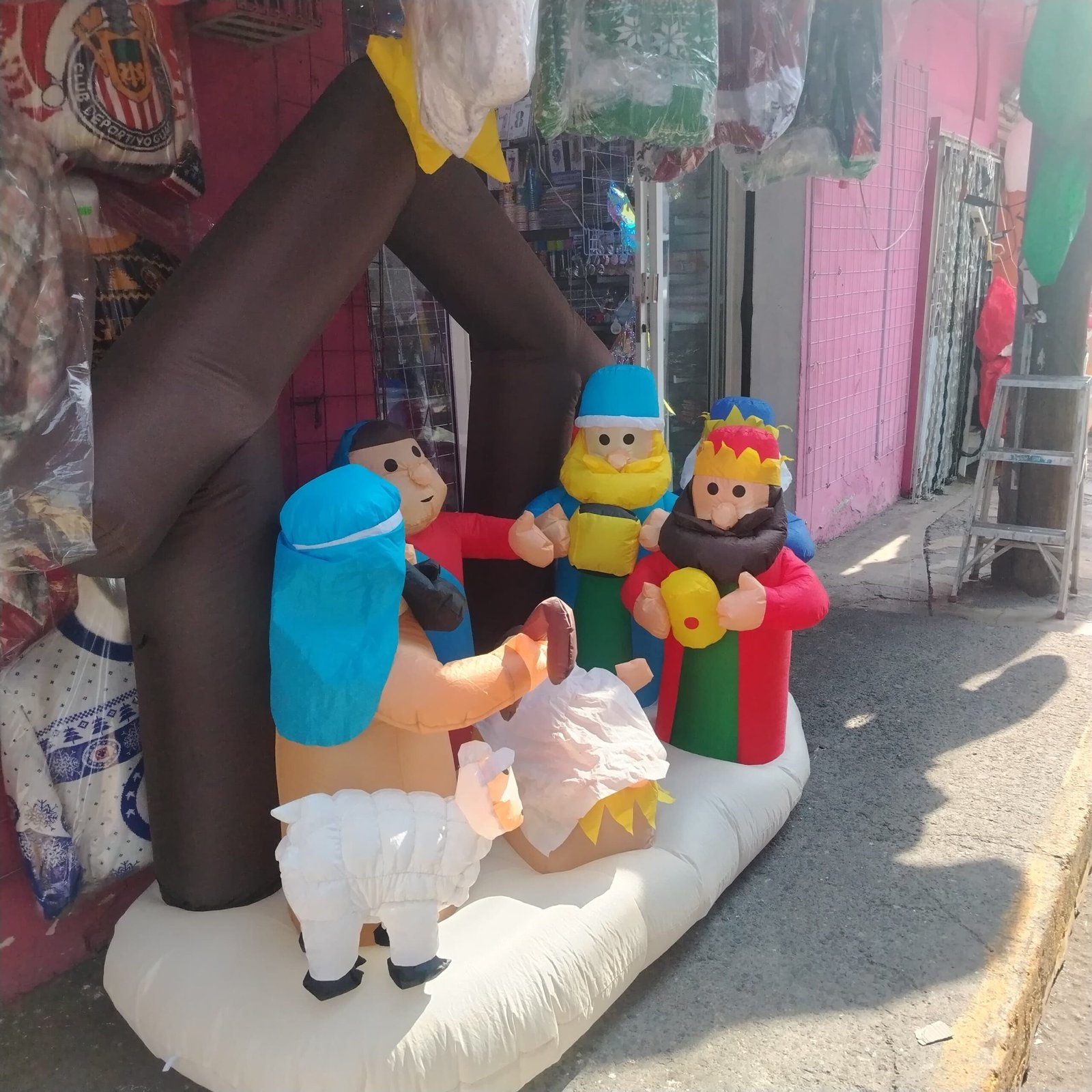 Nacimiento inflable gigante con Sagrada Familia, Reyes Magos y portal, ideal para decorar fachadas, iglesias, escuelas y negocios en Navidad.